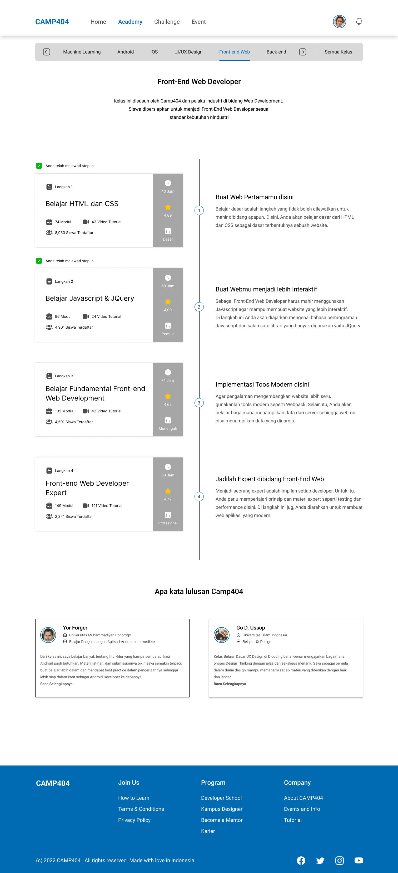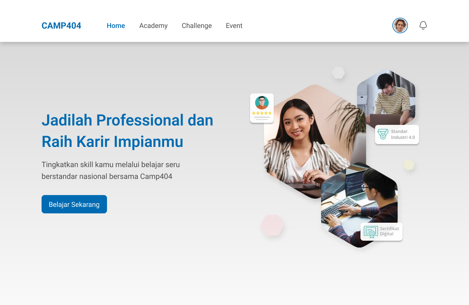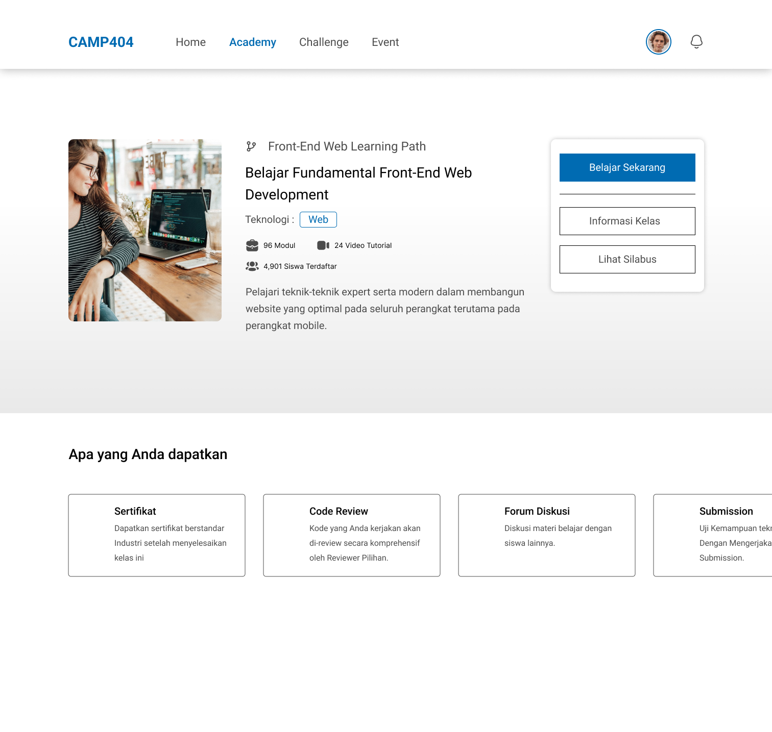 Camp404 adalah sebuah website course untuk mengasah skill penggiat IT yang baru launching sekitar 1 tahun yang lalu dan masih butuh banyak improve, seperti pada navbar, flow registrasi, penambahan fitur learning path, dll